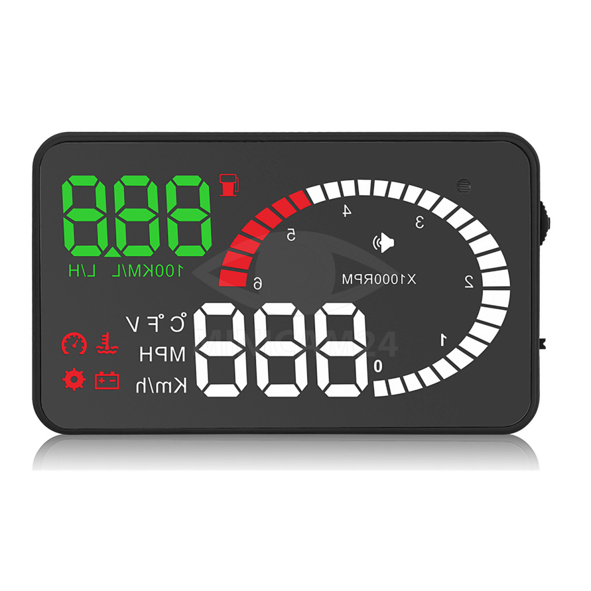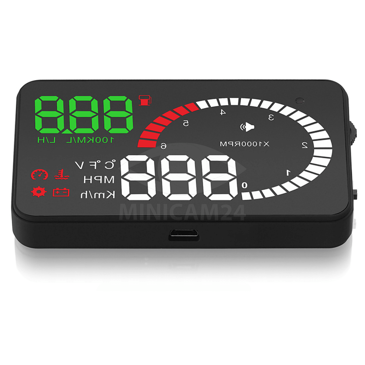 CarDisplay X6 – современный прибор, специально разработанный для повышения безопасности движения. С его помощью вы сможете контролировать все рабочие показатели автомобиля, не отвлекаясь от просмотра дороги перед собой. Использование такого устройства очень актуально в ночное время при движении по оживленным магистралям, а также при езде на высокой скорости. Проектор отображает на лобовом стекле следующие показатели: число оборотов двигателя, скорость движения (в км/час или миль/час), расход топлива (мгновенный, на километр, в час, при остановке), количество топлива, наличие масла, зарядку аккумулятора. В зависимости от индивидуальных особенностей, вы можете настроить белый или желтый цвет индикации. Подключается к автомобилю через OBDII разъем.