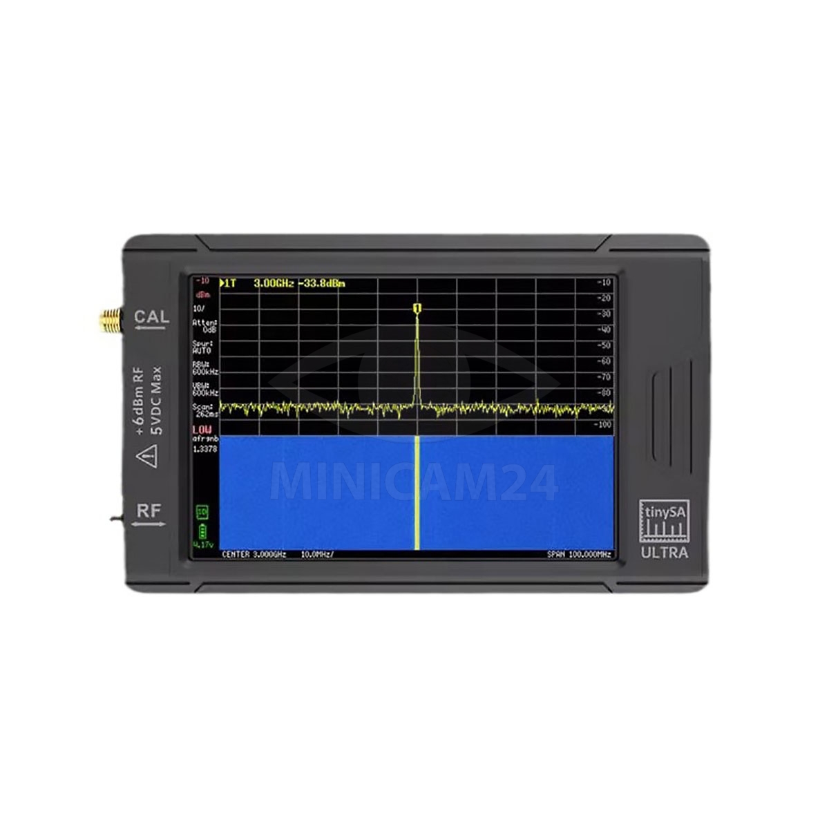 Портативный анализатор спектра TinySA ULTRA 4 — компактный и мощный инструмент для анализа радиоволн. С 4-дюймовым TFT LCD-дисплеем (480×320), TinySA ULTRA 4 обеспечивает удобный просмотр и точную настройку всех параметров. Он поддерживает анализ спектра до 800 МГц в обычном режиме и до 6 ГГц в режиме Ultra, а также предлагает выбор выходной частоты — синусоидальную волну до 800 МГц и прямоугольную до 4,4 ГГц, что делает его универсальным для различных радиочастотных применений.
