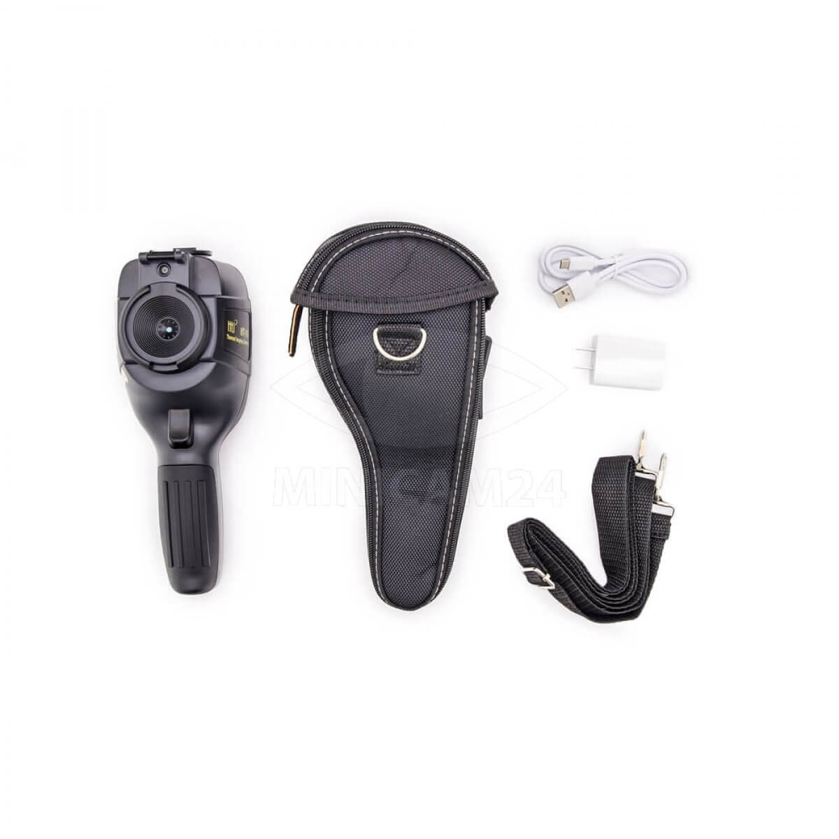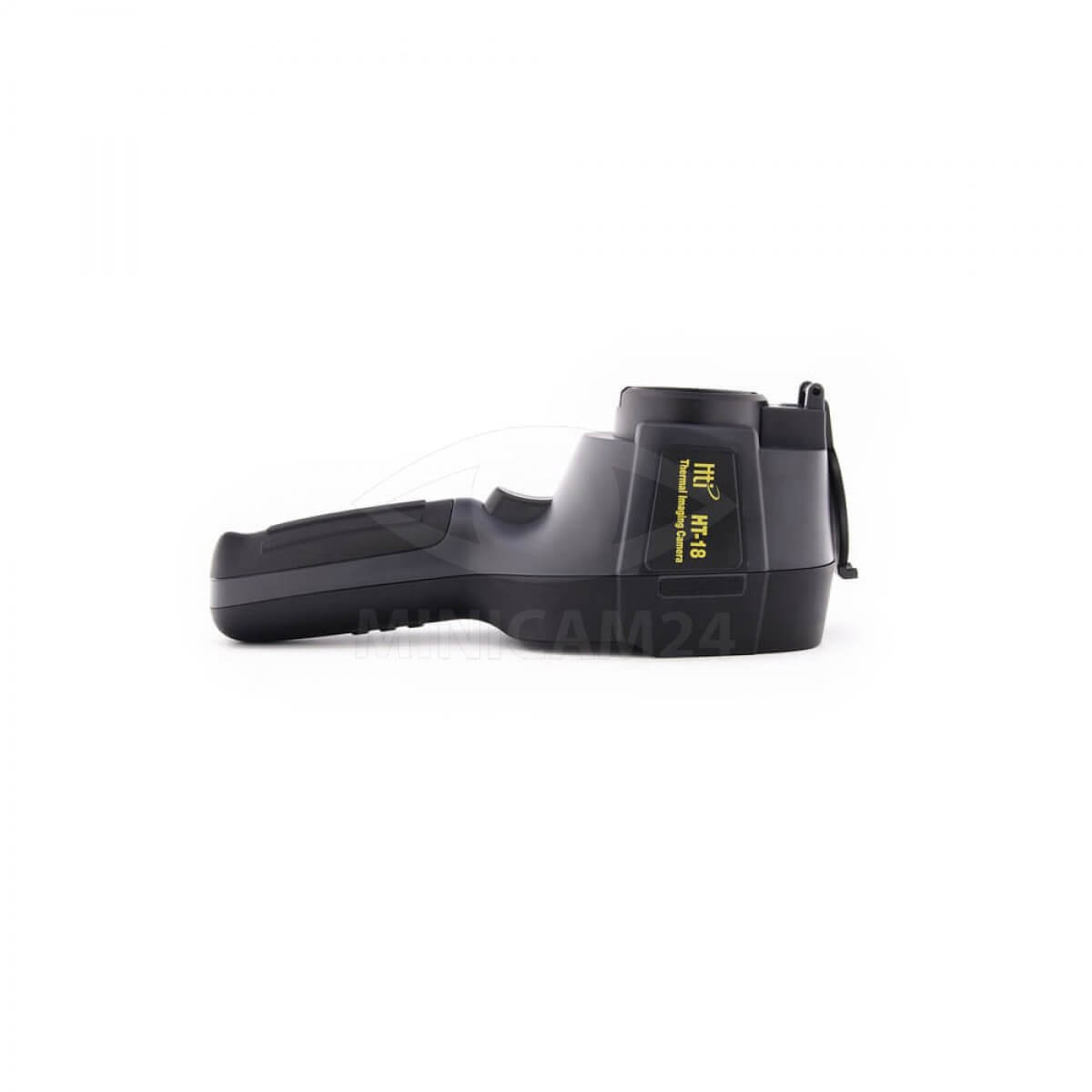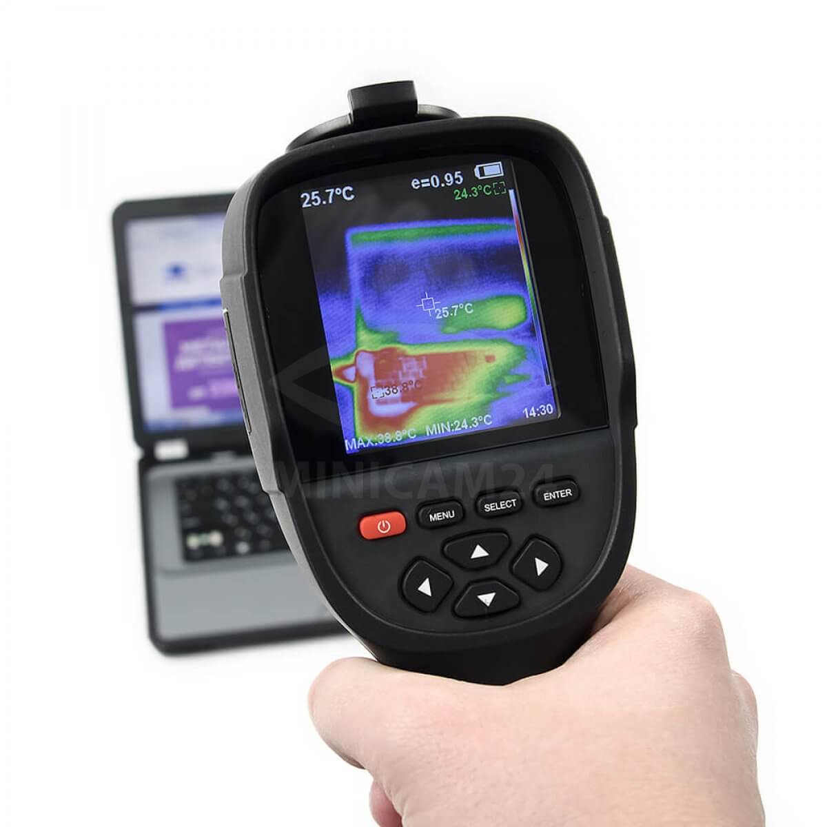 Ручной теплоизмерительный прибор с удобной рукоятью и курком для включения. В основе прибора болометрическая матрица разрешением 220х160 элементов. Прибор так же оборудован камерой видимого спектра с разрешением 0.3 Мп и может совмещать на одном экране изображение в видимом спектре и его тепловое изображение. Предел измерения температуры от -20 до 300 градусов с точностью 5%. Питается прибор от встроенного аккумулятора напряжением 3.7 вольта. Для передачи видеофайлов на ПК или смартфон предусмотрен порт USB.